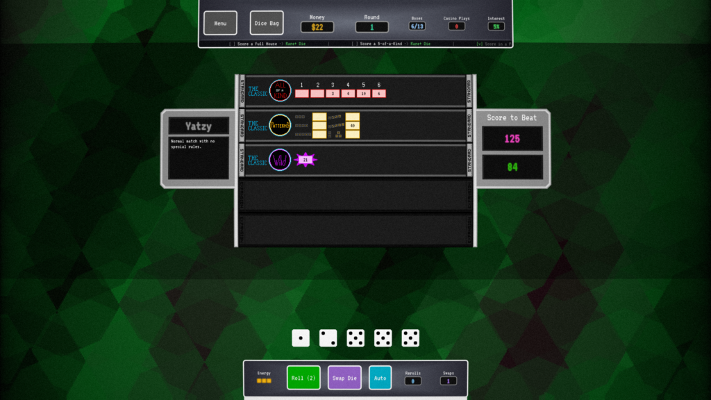 Heavily inspired by Balatro, which you should go buy. Quarriors, too. After learning the game was made in Lua, I decided to make a simple game to learn it myself to make a 90’s-style dungeon crawler. Yahtzy seemed like a good choice for a simple game. After completing it I decided to make it a little more complicated, and things quickly spiraled out of control.